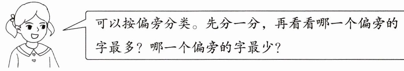 可以按偏旁分类。先分一分,再看看哪一个偏旁的字最多?哪一个偏旁的字最少?