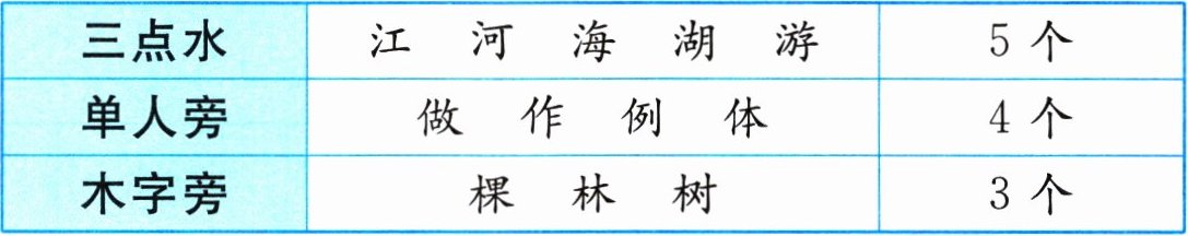 按偏旁:三点水最多,木字旁最少;按结构:左右7个,左中右5个。