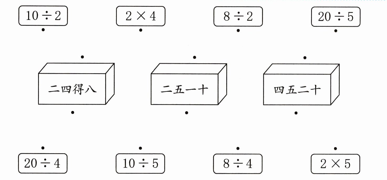 $10÷2$连“二五一十”,$2×4$连“二四得八”,$8÷2$连“二四得八”,$20÷5$连“四五二十”,$20÷4$连“四五二十”,$10÷5$连“二五一十”,$8÷4$连“二四得八”,$2×5$连“二五一十”。