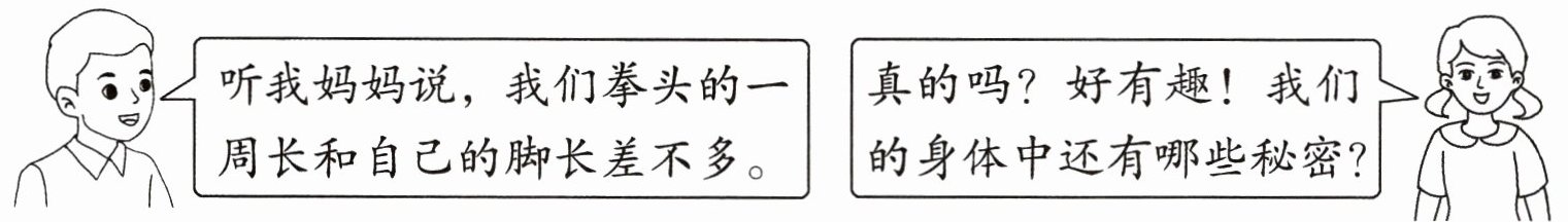1. 选择 2 名小伙伴,测量一下他们拳头的一周长和脚长,把测量结果记录在表中。