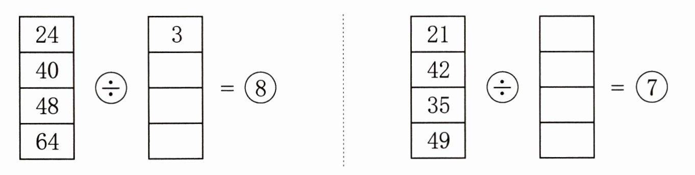 $5× ( )= 40$$ $$( )× 7= 49$$ $$28÷ ( )= 4$