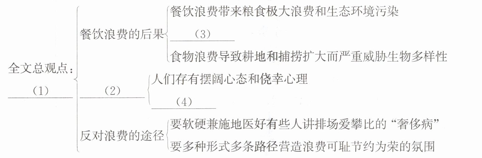 12.(1)要切实培养节约习惯,杜绝餐饮浪费现象;(2)餐饮浪费的原因;(3)食物浪费导致生产资源(水、能源、土地等)被大量无效消耗和温室气体高排放;(4)一些经济利益因素(如餐馆最低消费、“吃播”等)的推波助澜