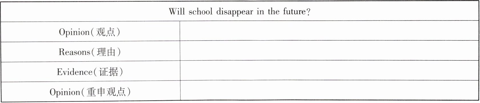 | Opinion(重申观点) | Schools will not disappear in the future. |