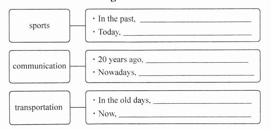 sports: In the past, people usually did simple sports like running and jumping. Today, people can do various sports such as swimming, playing basketball and going to the gym. communication: 20 years ago, people mainly communicated by writing letters or using fixed-line telephones. Nowadays, people use smartphones to call, text and video chat easily. transportation: In the old days, people often went out on foot, by bike or by slow buses. Now, people can take fast trains, planes and private cars to travel.