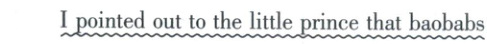 我告诉小王子,猴面包树不是灌木,而是像教堂那么高的树,即使他领一群大象去他的星球,它们也吃不完一棵猴面包树呢。