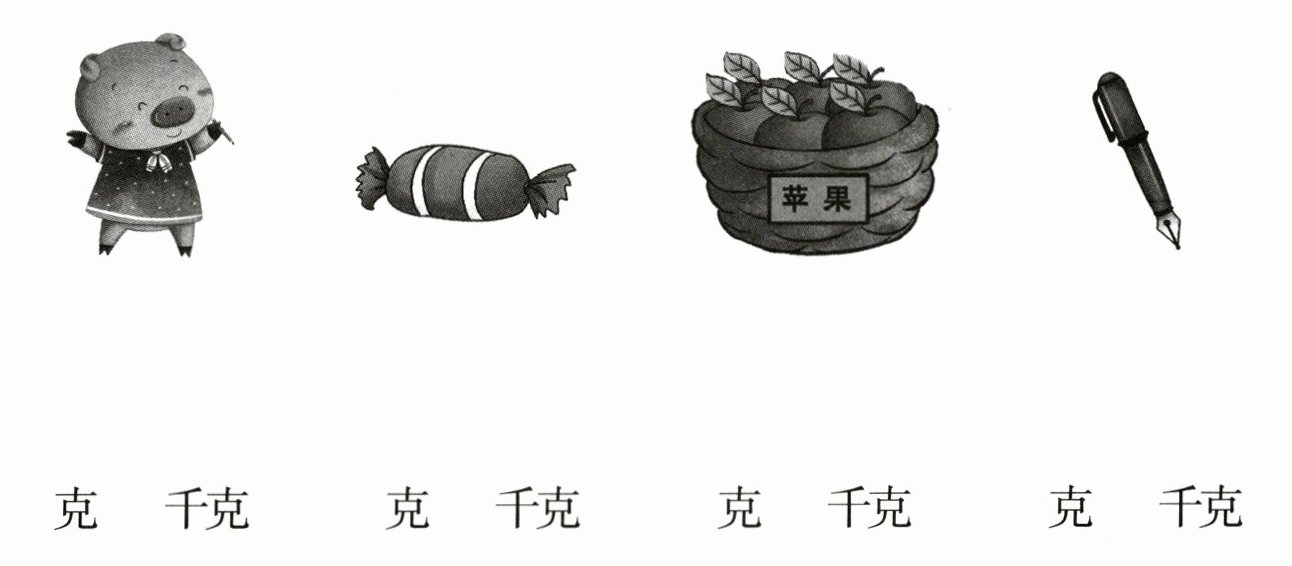 小猪 - 千克;糖果 - 克;苹果 - 千克;钢笔 - 克