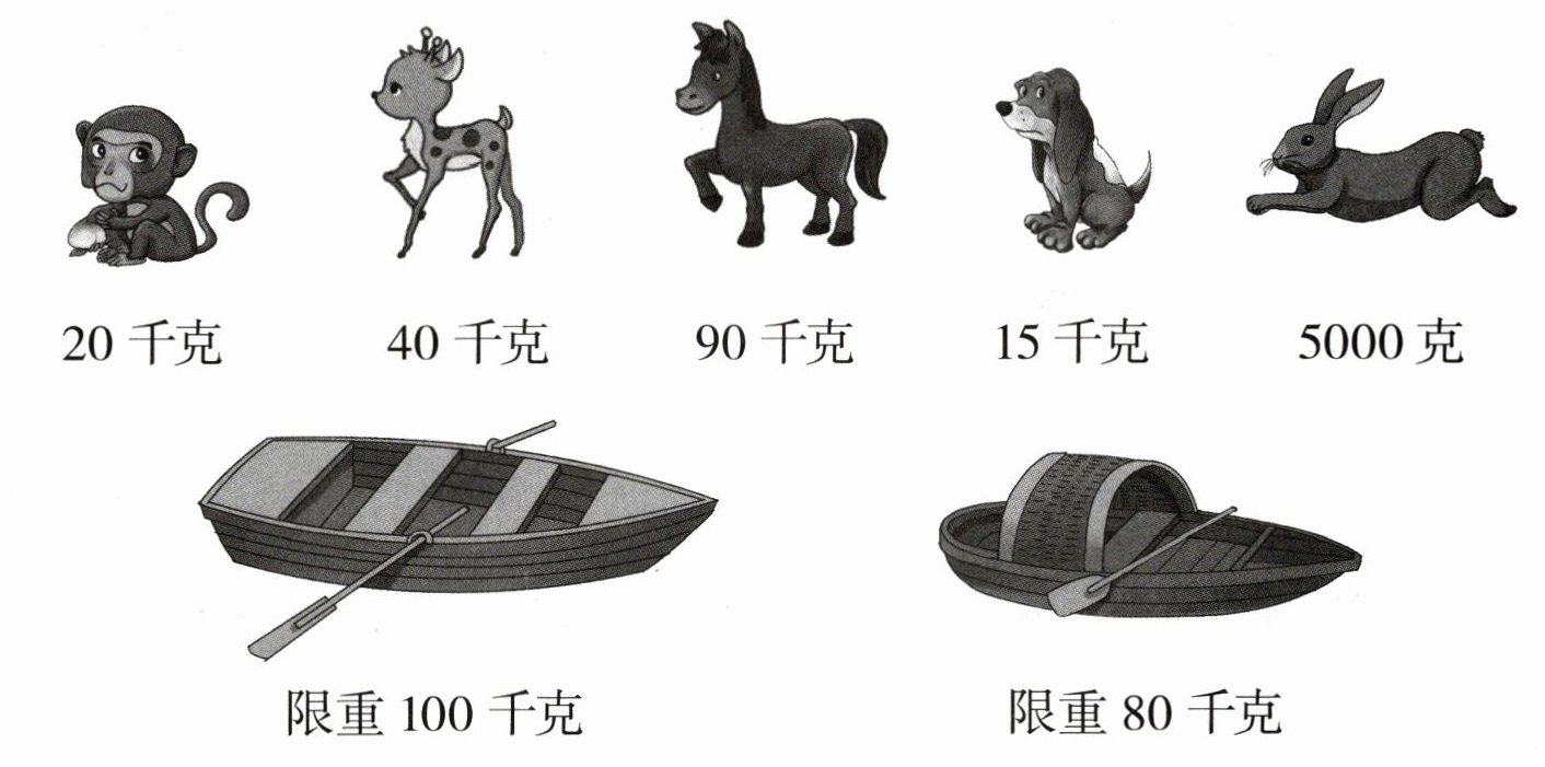 综上,马和兔子乘限重$100$千克的船,猴子、鹿和狗乘限重$80$千克的船才安全。