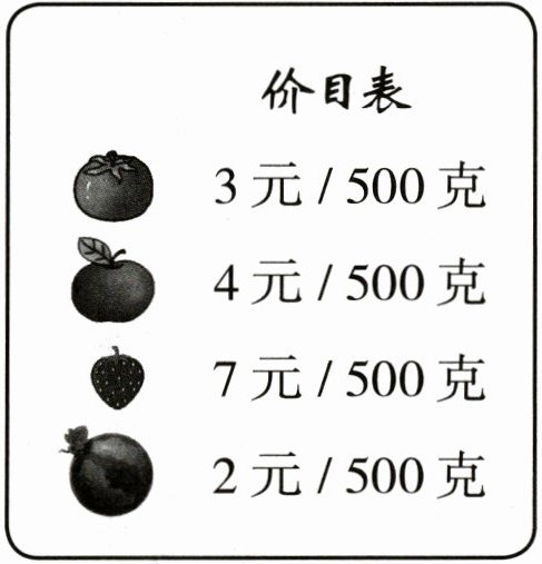 草莓:$7×(1×1000÷500)=7×2 = 14$(元)