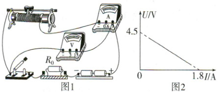 例2 实验小组测量某型号电池的电动势和内阻。电池内阻约为0.5 Ω。用电流表、电压表、滑动变阻器、定值电阻$R_0$(阻值为2 Ω)、待测电池等器材组成图1所示的实验电路,由测得的实验数据绘制成的U - I图像如图2所示。