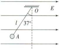 例 5 (2025·北京市部分学校期中)如图所示,长为$l的绝缘细线一端悬于O$点,另一端系一质量为$m$、电荷量为$q$的小球。现将此装置放在水平向右的匀强电场中,小球静止在$A$点,此时细线与竖直方向的夹角$\theta = 37^{\circ}$。重力加速度为$g$(已知$\sin 37^{\circ} = 0.6$,$\cos 37^{\circ} = 0.8$)。