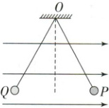 例 3 (2024·新课标卷,T18)如图,两根不可伸长的等长绝缘细绳的上端均系在天花板的$O$点,下端分别系有均带正电荷的小球$P$、$Q$;小球处在某一方向水平向右的匀强电场中,平衡时两细绳与竖直方向的夹角大小相等,则