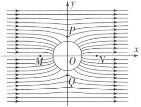 1. (静电感应和静电平衡) (2025·河南周口市期中) 在水平向右的大小为 $ E_0 $ 的匀强电场中,放入一不带电的导体球,导体球在静电平衡后其周围的电场分布如图所示,以球心 $ O $ 为坐标原点建立直角坐标系,$ x $ 轴平行于原匀强电场的方向。已知 $ M $、$ N $ 为 $ x $ 轴上关于 $ O $ 点对称的两个点,两点电场强度分别为 $ E_M $、$ E_N $,$ P $、$ Q $ 为 $ y $ 轴上关于 $ O $ 点对称的两个点,两点电场强度分别为 $ E_P $、$ E_Q $,且有 $ E_N > E_0 $,$ E_Q < E_0 $,下列说法正确的是(
