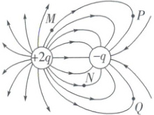 例6 (2025·山西长治联考)如图所示的是一对电荷量分别为 $ +2q (q > 0) $ 和 $ -q $ 的点电荷的电场线分布,$ M, N, P, Q $ 为电场中的四点。下列说法正确的是(