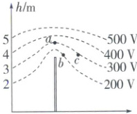 例5(多选)(2025·安徽六安期中)平时我们所处的地球表面,实际上存在场强大小为 $ 100V/m $ 的电场,可将其视为匀强电场。在地面立一金属杆后空间中的等势面如图所示,空间中存在 $ a $、$ b $、$ c $ 三点,其中 $ a $ 点位于金属杆正上方,$ b $、$ c $ 等高,则下列说法正确的是(