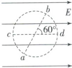 例3(多选)如图,在匀强电场中有一虚线圆,$ ab $ 和 $ cd $ 是圆的两条直径,其中 $ ab $ 与电场方向的夹角为 $ 60^{\circ} $,$ ab = 0.2m $,$ cd $ 与电场方向平行,$ a $、$ b $ 两点的电势差 $ U_{ab} = 20V $,则(