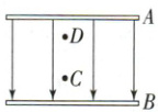 例8 如图所示,带有等量异种电荷、相距 $ 10cm $ 的平行金属板 $ A $ 和 $ B $ 之间有匀强电场,电场强度方向向下。电场中 $ C $ 点距 $ B $ 板 $ 3cm $,$ D $ 点距 $ A $ 板 $ 2cm $。已知一个电子从 $ C $ 点移动到 $ D $ 点的过程中,受到的静电力 $ F $ 大小为 $ 3.2 × 10^{-15}N $。(已知电子电荷量大小 $ e = 1.6 × 10^{-19}C $)