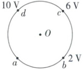 解析:选A。圆心O的电势$φ_{O}=\frac {φ_{a}+φ_{b}}{2}=6V$,则O点和c点连线为等势线,则电场强度方向沿aO指向O点,电场强度的大小$E=\frac {U_{aO}}{R}=2V/cm$,A正确,B、C错误;a、O两点电势相等,可知电子从a点运动到O点,静电力做功为零,D错误。