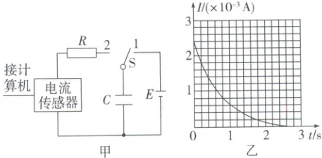 例5 某同学用电流传感器观察电容器的放电过程。甲图为该实验电路图,其中电源电压恒为6V。该同学先将开关接1为电容器充电,待电容器充满电再将开关接2,利用传感器记录电容器放电过程,得到该电容器放电过程的I-t图像如图乙(已知Q= It)。