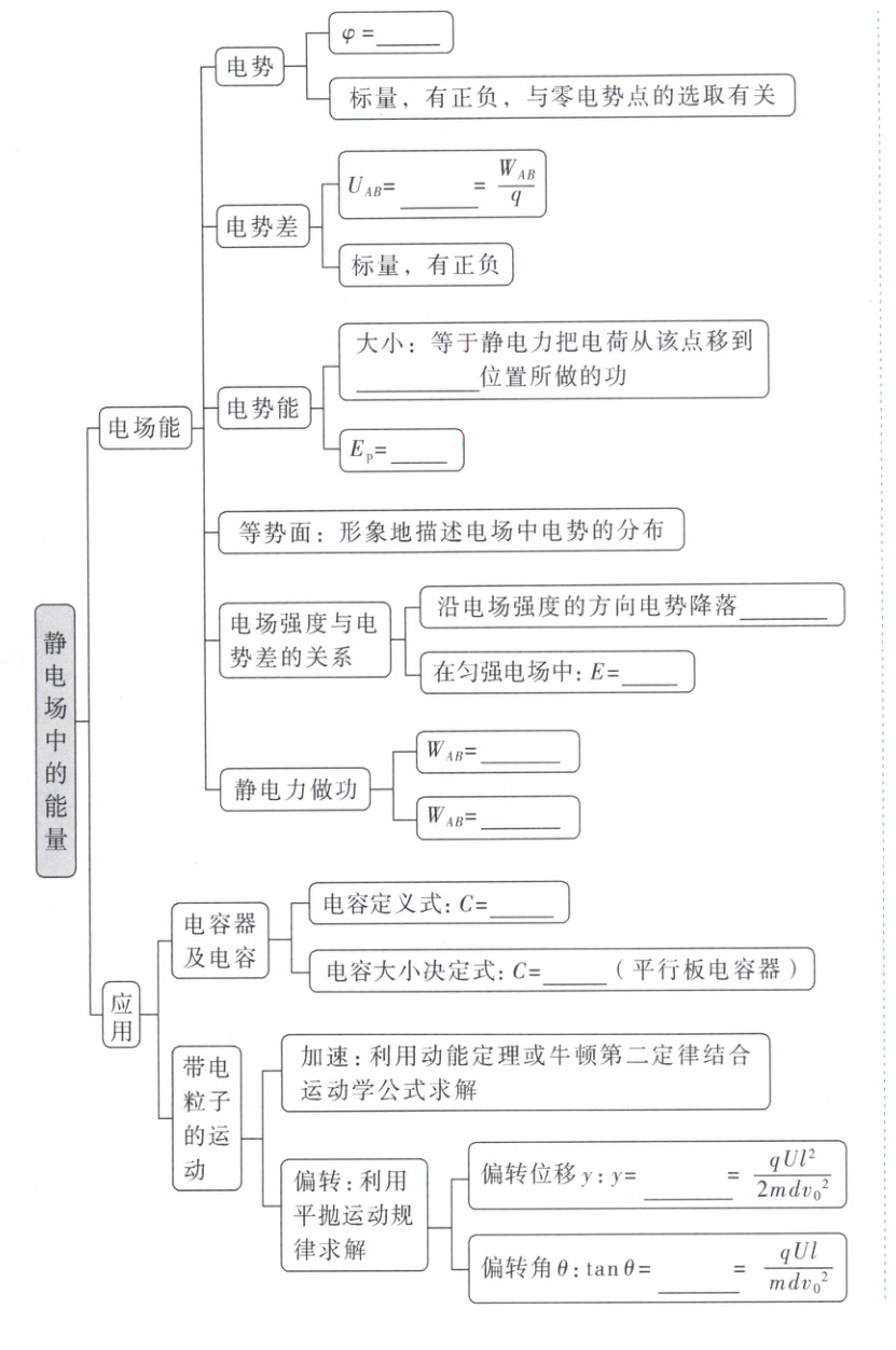 $\frac{E_p}{q}$;$\varphi_A - \varphi_B$;零电势;$q\varphi$;最快;$\frac{U}{d}$;$qU_{AB}$;$E_pA - E_pB$;$\frac{Q}{U}$;$\frac{\varepsilon_r S}{4\pi kd}$;$\frac{1}{2}at^2$;$\frac{v_y}{v_0}$