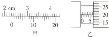 (1)该实验小组分别用$20$分度的游标卡尺、螺旋测微器测量其长度$L和直径D$,某次测量结果如图甲、乙所示,长度$L= \underline{\hspace{1cm}}$cm,直径$D= \underline{\hspace{1cm}}$mm。