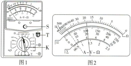 (选填“0”或“∞”)刻线。③将两表笔分别与待测电阻相接,发现指针偏转角度过小,如图 2 中虚线所示,则应将 K 旋转到电阻挡“×