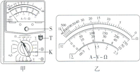 (选填“S”或“T”),使电表指针对准电阻挡的 0 刻度线。(4)将红、黑表笔分别与待测电阻两端接触,若多用电表读数如图乙所示,则该电阻的阻值为___