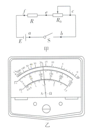 例 5 (2024·广东金山中学期中)多用电表可以用来测电压、测电流、测电阻、检验二极管的导电性能,还可以探究故障电路。某同学发现如图甲所示的实验电路不能正常工作,为排查电路故障,他用多用电表测量闭合电路中各点间的电压得到$U_{ab}= U_{bc}= U_{ce}= 0$,$U_{ef}= 6V$。已知只有一处故障,为进一步判断电路故障的性质,他断开开关 S 后,将选择开关置于电阻挡的×1 挡,分别将红、黑表笔接 ce 端时,指针指在如图乙所示的位置,则该电阻为___