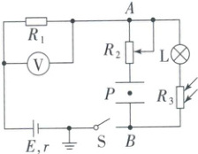 例7 (2025·广东深圳市期末)如图所示的电路中,$E$为电源,其内阻为$r$,$V$为理想电压表,$L$为阻值恒定的小灯泡,$R_{1}$为定值电阻,$R_{3}$为半导体材料制成的光敏电阻(光照越强,电阻越小),电容器两极板处于水平状态,闭合开关$S$,电容器中心$P$点有一带电油滴处于静止状态,电源负极接地,下列说法正确的是
