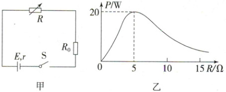 3. (闭合电路的功率和效率)(多选)(2025·四川攀枝花市期中)将一电源与电阻箱$R$、定值电阻$R_{0}= 4\Omega$连接成闭合回路,如图甲所示。测得电阻箱所消耗功率$P与电阻箱读数R$的关系如图乙所示,则下列说法正确的是(