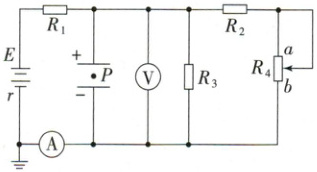 4. (含电容器电路的分析)如图所示,平行金属板中有一个带电油滴悬浮在两板间的$P$点,电流表和电压表可以看作理想电表,电源负极接地,当滑动变阻器$R_{4}的滑片向b$端移动时,下列说法正确的是