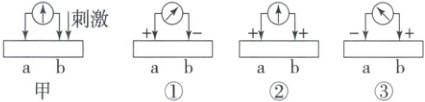 选A。刺激产生的神经冲动传至b点前,a点和b点都为静息电位,电流表指针偏转情况为图②所示;当神经冲动由右向左传导至b点时,b点出现动作电位,a点为静息电位,电流表指针偏转情况为图①所示;紧接着b点恢复为静息电位,a、b两点电位相同,此时电流表指针偏转情况为图②所示;神经冲动继续向左传导,当神经冲动传导到a点时,a点出现动作电位,b点为静息电位,则指针偏转情况为图③所示;之后a点恢复静息电位,a、b两点电位相同,指针偏转情况为图②所示。综上所述,电流表指针偏转的顺序是②→①→②→③→②,故选A。