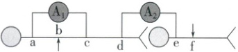 D.刺激b点时,A₁指针不偏转,A₂指针偏转两次;刺激f点时,A₁指针不偏转,A₂指针偏转一次