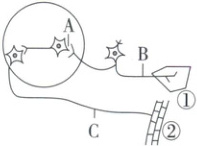 选C。由题图可知B所在神经为传入神经,C所在神经为传出神经,②为效应器。由于突触的存在,兴奋在反射弧中的传递是单向的,即只能从传入神经传到神经中枢再传到传出神经。若将药物放在B处,刺激C处,无论药物能否阻断兴奋在神经元之间的传递,效应器都将发生反应。