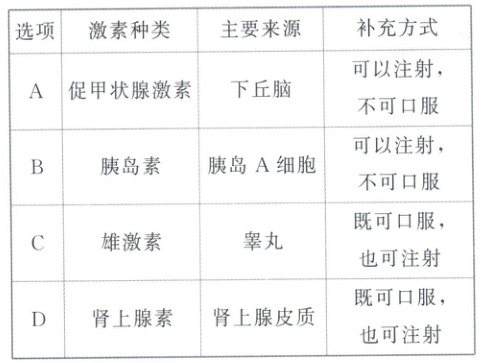 2. 下列关于激素种类、主要来源及其补充方式的叙述,对应正确的是(