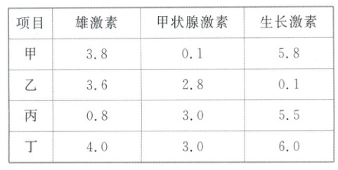 1. 现有体重近似、发育正常的甲、乙、丙、丁四只雄性小狗,对丁狗不做处理,甲、乙、丙狗分别做不同的手术处理。几个月后测得各自血液中三种激素的含量如下表所示,下列叙述错误的是(