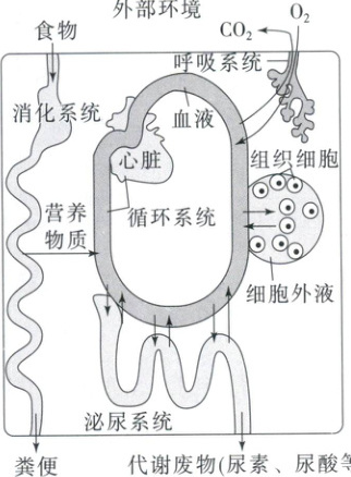 (3)组织细胞代谢产生的${CO_{2}}$和尿素首先进入组织液,再进入血液循环系统,然后${CO_{2}}$经呼吸系统排出体外,尿素经泌尿系统和皮肤等排出体外