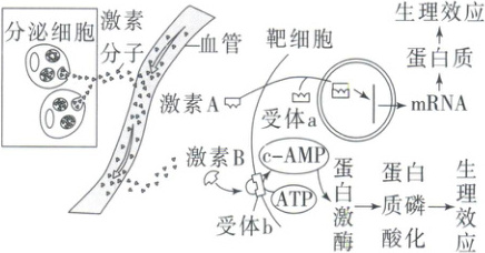 (1)内分泌腺没有导管,其分泌的激素A、B弥散到体液中,随血液流到全身,不会定向运输到靶器官、靶细胞。