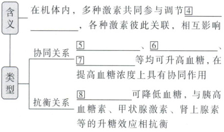 协同关系:⑤胰高血糖素、⑥甲状腺激素、⑦肾上腺素等均可升高血糖,在提高血糖浓度上具有协同作用