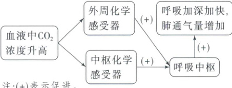 血液中CO₂浓度升高→外周化学感受器、中枢化学感受器→呼吸中枢→呼吸加深加快,肺通气量增加(注:(+)表示促进)