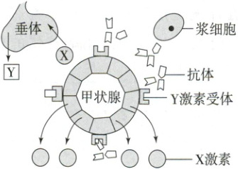 2. (2025·广东东莞高二校联考期中)Graves氏病的病因如下图所示,是由患者所产生的某种抗体与Y激素受体结合,使甲状腺细胞持续激发,产生高水平X激素所致。研究发现寡核苷酸UDP能够减弱Graves氏病症状。下列有关说法错误的是(