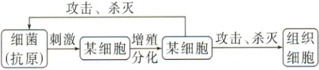 细菌(抗原)→刺激某细胞→增殖分化某细胞→攻击、杀灭组织细胞
