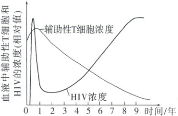 HIV浓度和辅助性T细胞的变化:纵轴血液中辅助性T细胞相对值和HIV浓度(相对值);横轴时间/年;HIV浓度先上升后下降,然后上升;辅助性T细胞浓度先上升后下降,然后缓慢上升