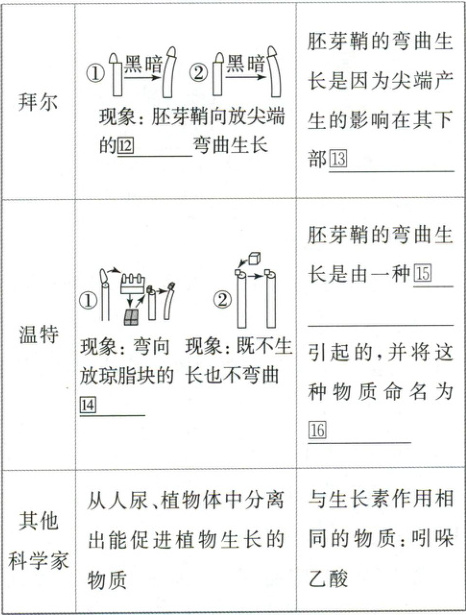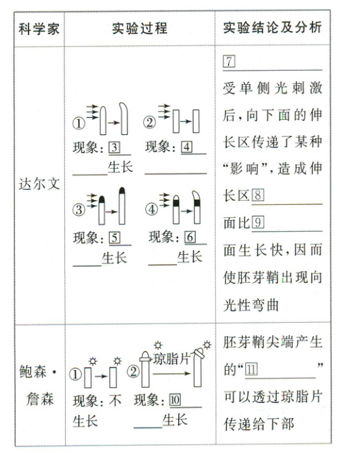 ③向光弯曲 ④既不生长也不弯曲 ⑤直立 ⑥向光弯曲 ⑦胚芽鞘的尖端 ⑧背光 ⑨向光 ⑩向光弯曲 ⑪影响 ⑫对侧 ⑬分布不均匀 ⑭对侧 ⑮化学物质 ⑯生长素