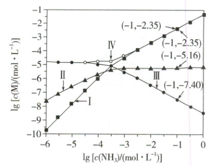 5. (2023·新课标卷) 向 $AgCl$ 饱和溶液(有足量 $AgCl$ 固体)中滴加氨水,发生反应 $Ag^+ + NH_3 \rightleftharpoons [Ag(NH_3)]^+$ 和 $[Ag(NH_3)]^+ + NH_3 \rightleftharpoons [Ag(NH_3)_2]^+$,$\lg [c(M) / (mol \cdot L^{-1})]$ 与 $\lg [c(NH_3) / (mol \cdot L^{-1})]$ 的关系如下图所示 $\{$ 其中 $M$ 代表 $Ag^+$、$Cl^{-}$、$[Ag(NH_3)]^+$ 或 $[Ag(NH_3)_2]^+\}$。
