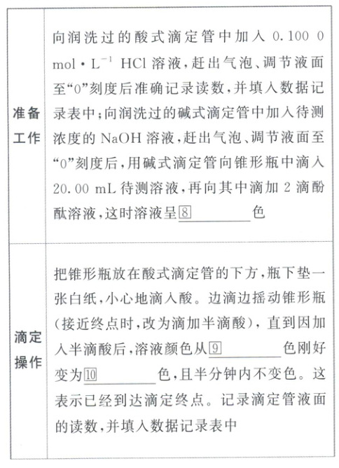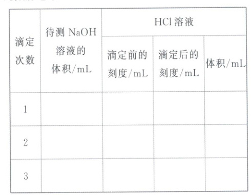 2. 试剂:$0.100 0 mol·L⁻^1 HCl $溶液、$0.100 0 mol·L⁻^1 $左右的 NaOH 溶液、酚酞溶液、蒸馏水。