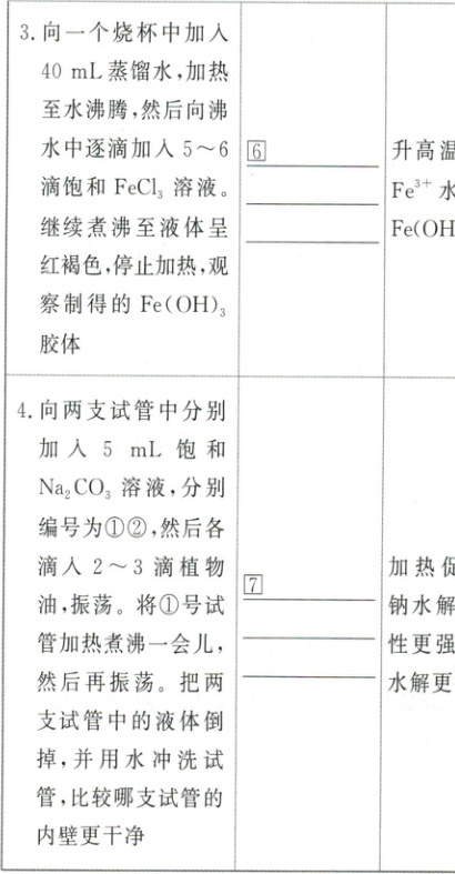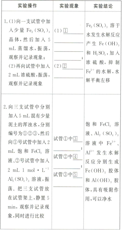 2. 实验1中:Fe³⁺+3H₂O⇌Fe(OH)₃+3H⁺,Fe(OH)₃+3H⁺=Fe³⁺+3H₂O;实验2中:Fe³⁺+3H₂O⇌Fe(OH)₃(胶体)+3H⁺、Al³⁺+3H₂O⇌Al(OH)₃(胶体)+3H⁺;实验3中:Fe³⁺+3H₂O$\xlongequal{\triangle}$Fe(OH)₃(胶体)+3H⁺;实验4中:CO₃²⁻+H₂O⇌HCO₃⁻+OH⁻。