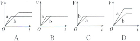 4. 向盛有等质量的两份锌粉的 a、b 试管中分别加入过量的稀硫酸,同时向 a 试管中加入少量的$ CuSO_4$溶液,产生$ H_2$的体积 V(L)与时间 t(min)的关系如下图所示。下列图像正确的是(