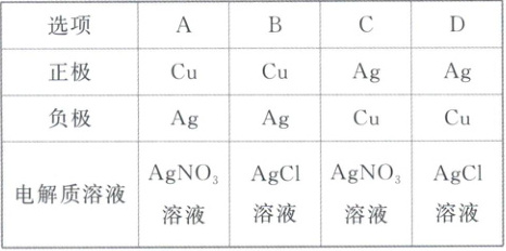 解析:选C。由原电池反应${Cu + 2Ag^{+}\xlongequal{}Cu^{2+} + 2Ag}$可知,该原电池的负极为Cu,电极反应式为${Cu - 2e^{-}\xlongequal{}Cu^{2+}}$,正极上溶液中的${Ag^{+}}$得到电子被还原为Ag单质,电解质溶液是可溶性银盐(如${AgNO_{3}}$)溶液,正极的电极材料可以是活动性比Cu弱的金属Ag或石墨等。