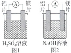 5. 某探究活动小组想利用原电池反应检测金属的活动性顺序,甲、乙两位同学均使用镁片和铝片作为电极,但甲同学将电极放入$ 6 mol·L⁻^1$的稀硫酸中(如图 1),乙同学将电极放入$ 6 mol·L⁻^1$的 NaOH 溶液中(如图 2)。