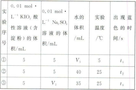 5. 某同学探究浓度和温度对化学反应速率的影响。实验原理及方案:在酸性溶液中发生反应$2IO_{3}^{-}+5SO_{3}^{2-}+2H^{+}= I_{2}+5SO_{4}^{2-}+H_{2}O$,生成的碘可用淀粉溶液检验,根据出现蓝色所需的时间来衡量该反应的速率。